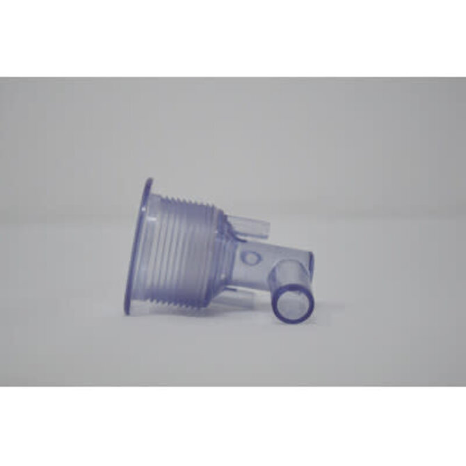 designed to take a 2-inch spigot (SPG) connection and split it into two 2-inch spigot connections while also providing a 3/4-inch barbed (BARB) port for the ozone injector.