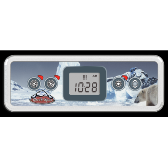 an adhesive replacement overlay for the Gecko in.k300 topside control panel. It is designed for use on specific Arctic Spas models, particularly the Bear Essential series.