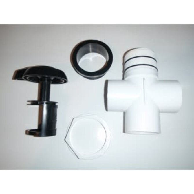 designed to take a 2-inch spigot (SPG) connection and split it into two 2-inch spigot connections while also providing a 3/4-inch barbed (BARB) port for the ozone injector.