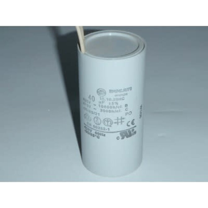 40 microfarad (uF) motor run capacitor used in two-speed pumps on specific Arctic Spas and Coyote hot tub models. It provides the necessary charge to activate the high-speed setting on the pump.