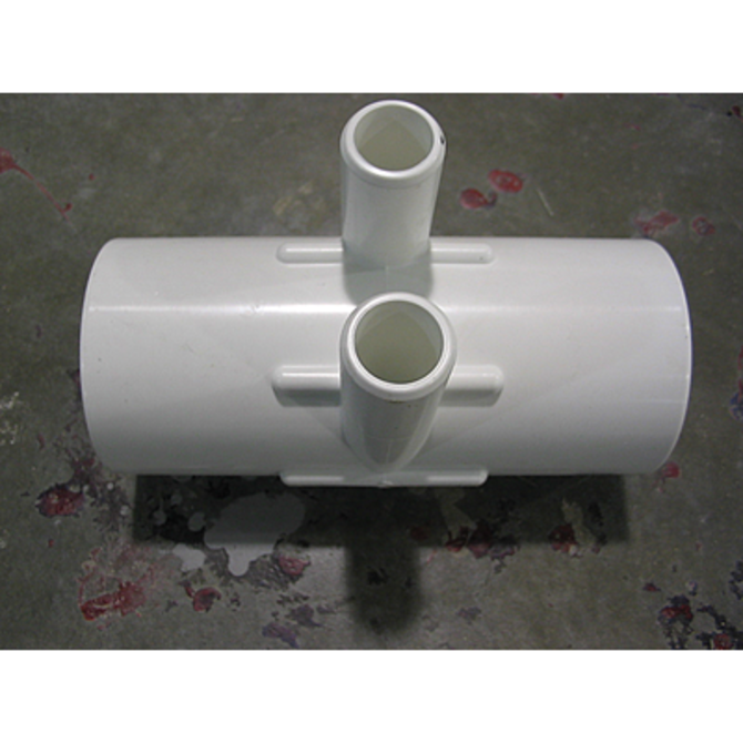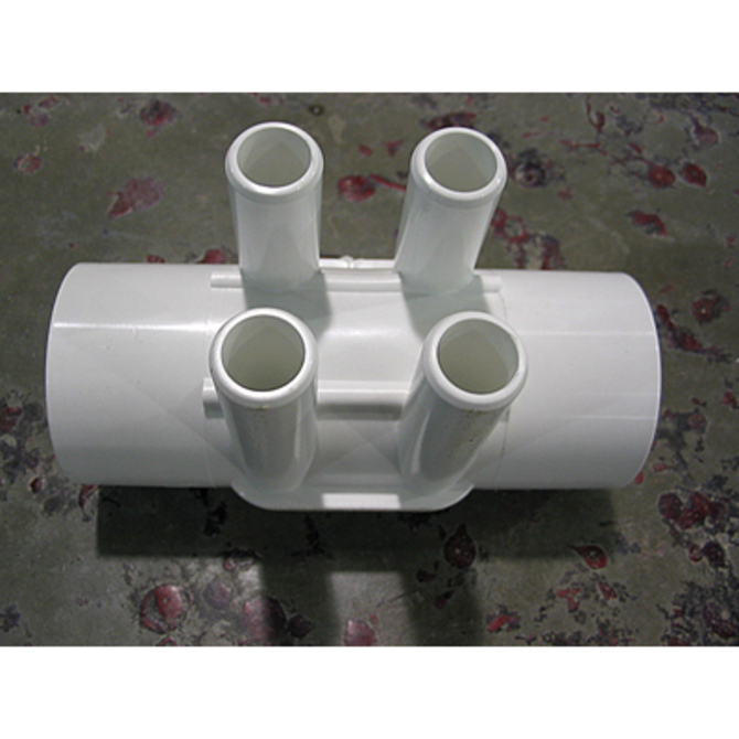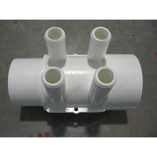 Used to distribute water from a 1-inch spigot (SPG) connection to four 3/8-inch barbed (BARB) ports that connect to the jet lines. The manifold has a 1-inch spigot (SPG) end, which is the same diameter as 1-inch pipe and glues inside a 1-inch slip (socket