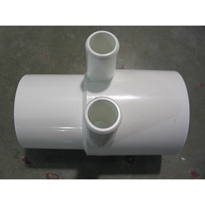 designed to take a 2-inch spigot (SPG) connection and split it into two 2-inch spigot connections while also providing a 3/4-inch barbed (BARB) port for the ozone injector.